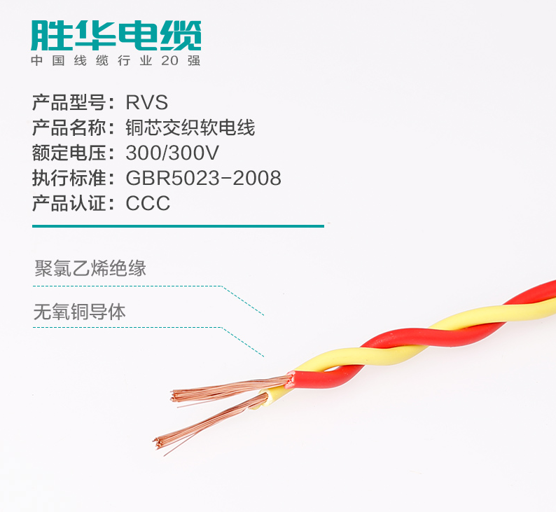 rvs电缆是两根绝缘铜线相互缠绕的软电线,常用的颜色有红黄、红蓝、红白、红绿、红黑。